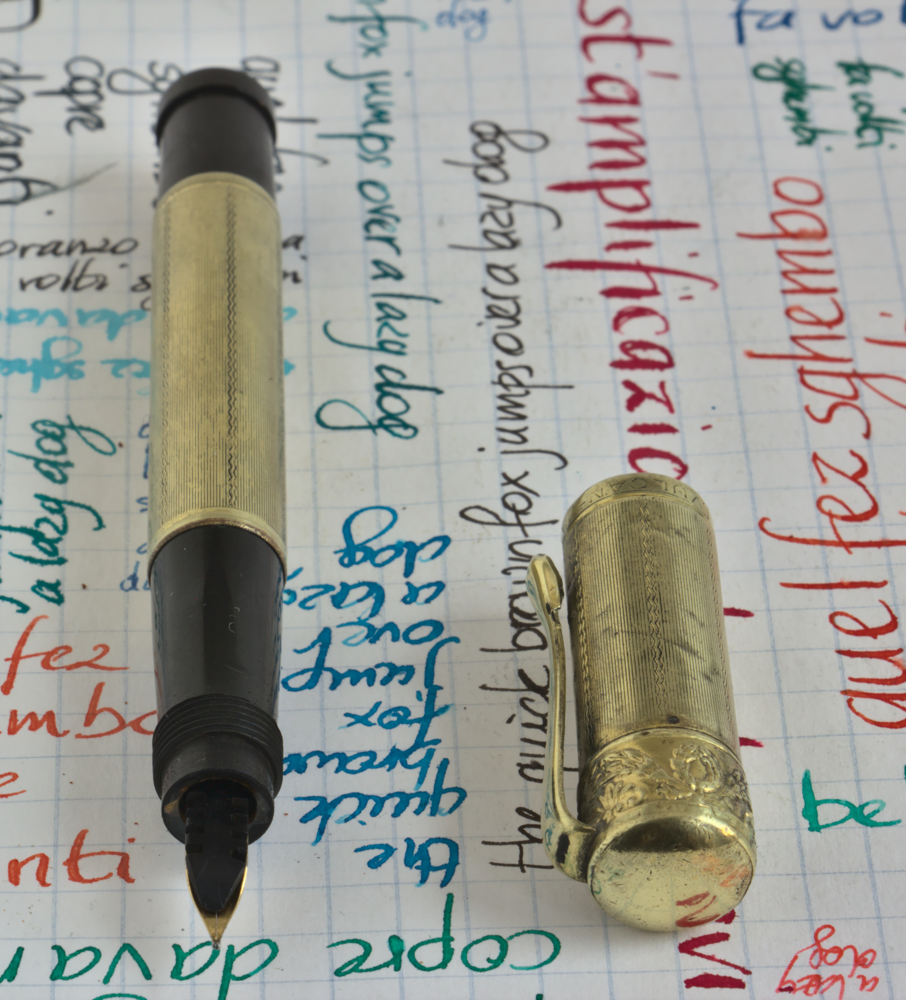 Photo of a pen produced by Vulcan. Filling system: safety. With thin lines with waves gold rolled overlay. Unknown model. Festoon band on cap top.