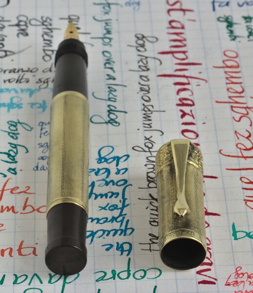 Photo of a pen produced by Vulcan. Filling system: safety. With thin lines with waves gold rolled overlay. Unknown model. Festoon band on cap top.
