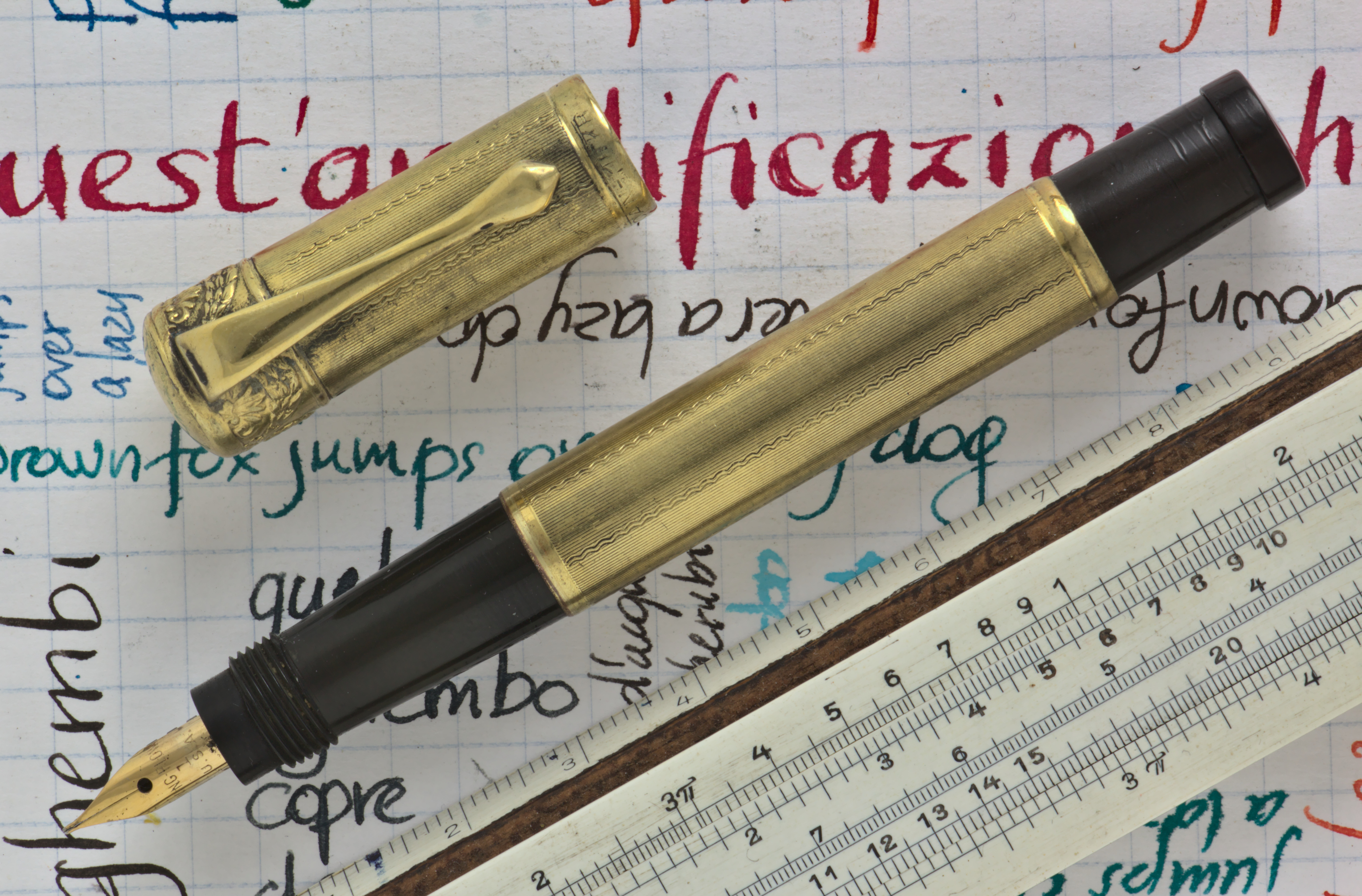 Photo of a pen produced by Vulcan. Filling system: safety. With thin lines with waves gold rolled overlay. Unknown model. Festoon band on cap top.