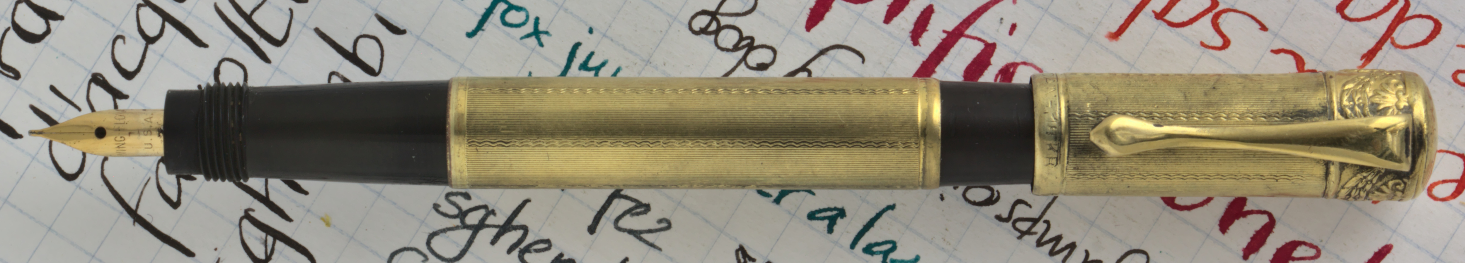 Photo of a pen produced by Vulcan. Filling system: safety. With thin lines with waves gold rolled overlay. Unknown model. Festoon band on cap top.