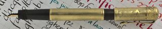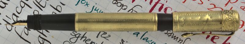Photo of a pen produced by Vulcan. Filling system: safety. With thin lines with waves gold rolled overlay. Unknown model. Festoon band on cap top.