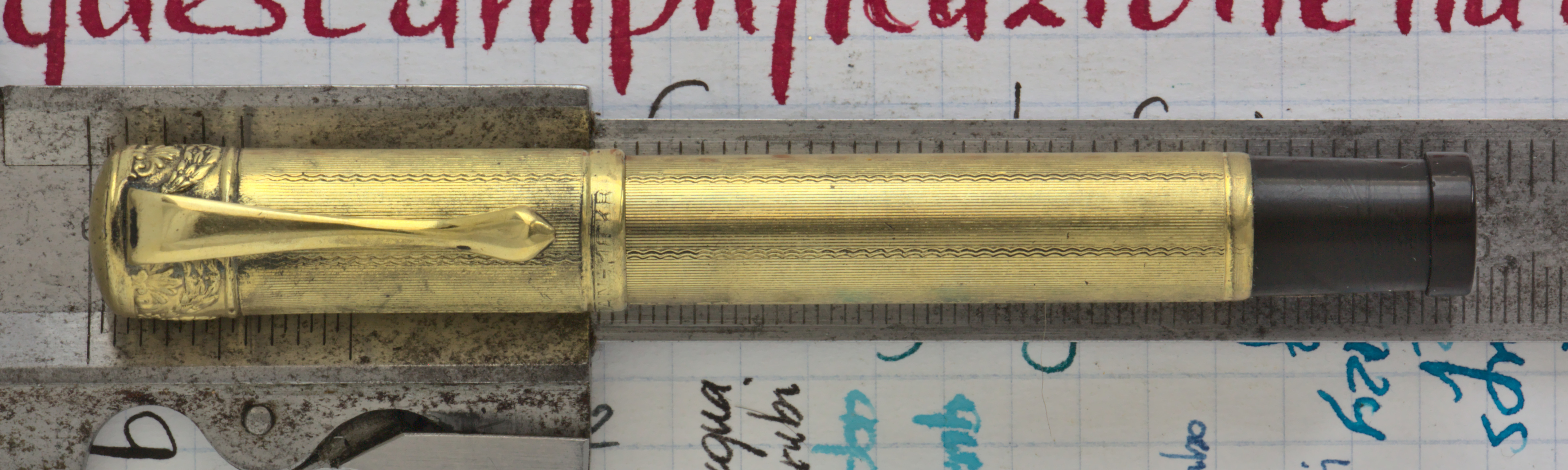 Photo of a pen produced by Vulcan. Filling system: safety. With thin lines with waves gold rolled overlay. Unknown model. Festoon band on cap top.