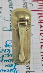 Photo of a pen produced by Vulcan. Filling system: safety. With thin lines with waves gold rolled overlay. Detail of cap. Detail of clip. Unknown model. Festoon band on cap top.