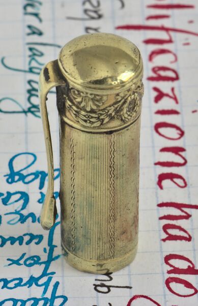 Versione del 16 mar 2022 alle 00:01 di Piccardi (discussione | contributi) (== Dettagli == {{PhotoInfo |Marca=Vulcan |Oggetto=pen |Particolare=cap,clip |Caricamento=safety |Materiale=overlay |MatDesc_it=a righe sottili e onde |MatDesc_en=thin lines with waves |Note_it=Modello ignoto. Banda a festoni sulla testa del cappuccio. |Note_en=Unknown model. Festoon band on cap top. |Licenza=Cc-by-sa-3.0 }})