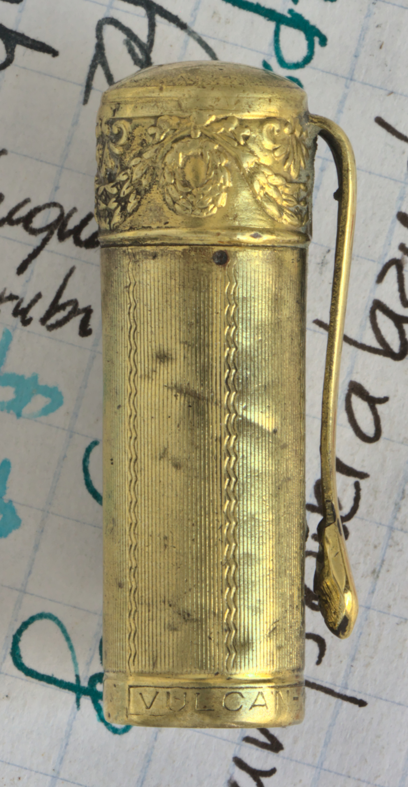 Photo of a pen produced by Vulcan. Filling system: safety. With thin lines with waves gold rolled overlay. Detail of cap. Detail of inscription. Unknown model. Festoon band on cap top.
