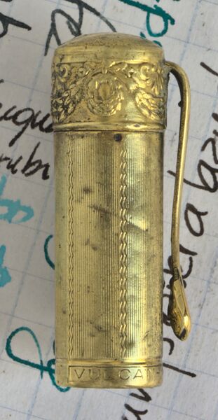 Versione del 16 mar 2022 alle 00:03 di Piccardi (discussione | contributi) (== Dettagli == {{PhotoInfo |Marca=Vulcan |Oggetto=pen |Particolare=cap,inscr |Caricamento=safety |Materiale=overlay |MatDesc_it=a righe sottili e onde |MatDesc_en=thin lines with waves |Note_it=Modello ignoto. Banda a festoni sulla testa del cappuccio. |Note_en=Unknown model. Festoon band on cap top. |Licenza=Cc-by-sa-3.0 }})