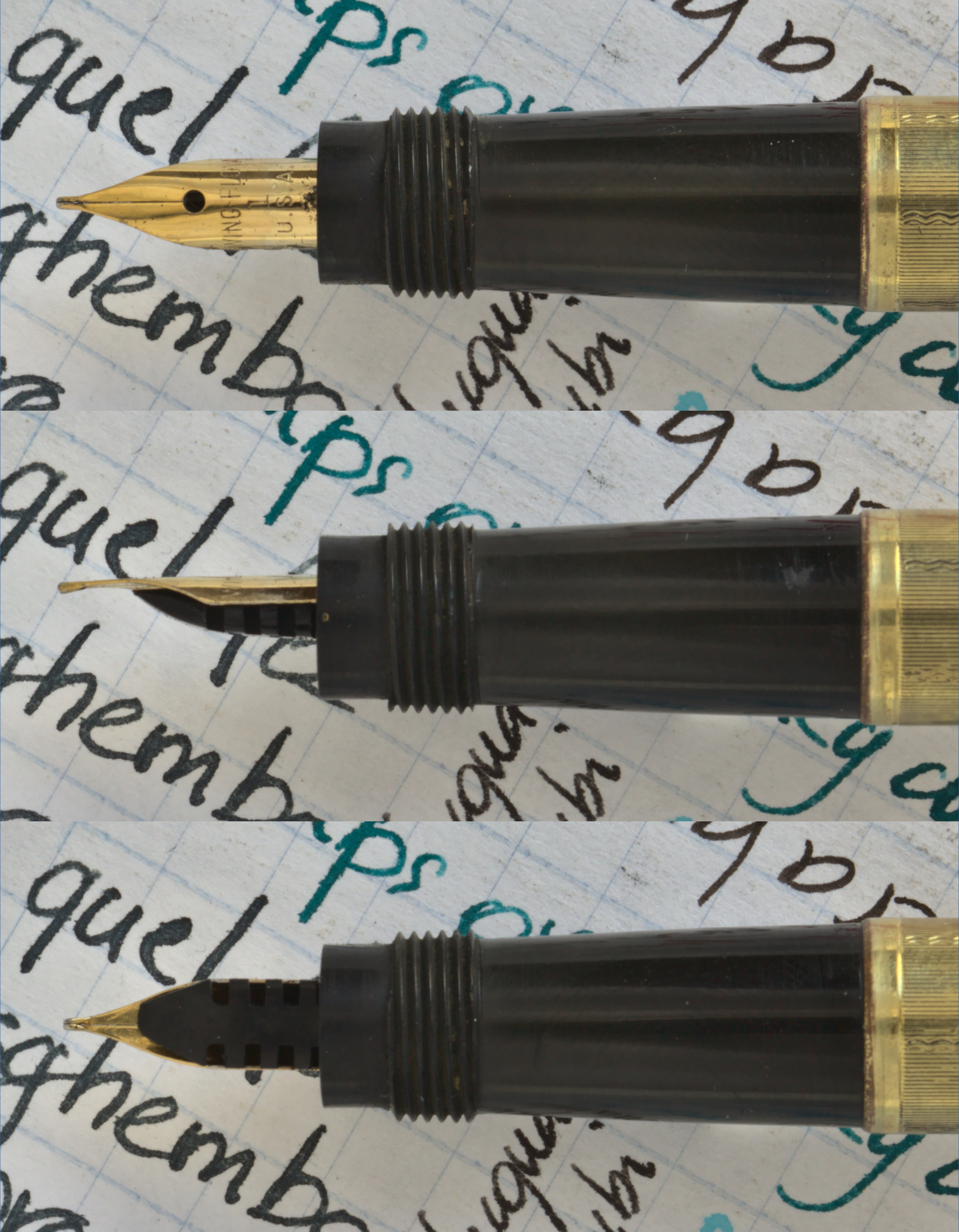 Photo of a pen produced by Vulcan. Filling system: safety. With thin lines with waves gold rolled overlay. Detail of nib. Detail of feeder. Unknown model. Festoon band on cap top.