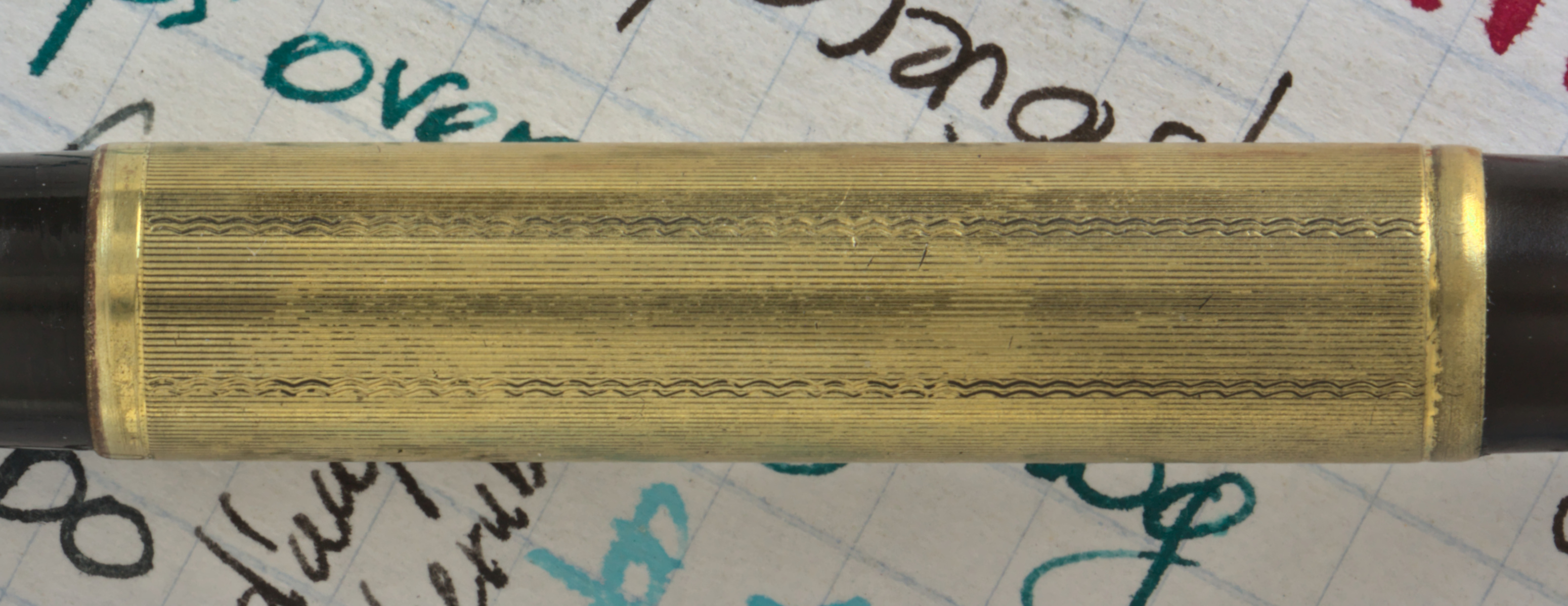 Photo of a pen produced by Vulcan. Filling system: safety. With thin lines with waves gold rolled overlay. Detail of barrel. Unknown model. Festoon band on cap top.