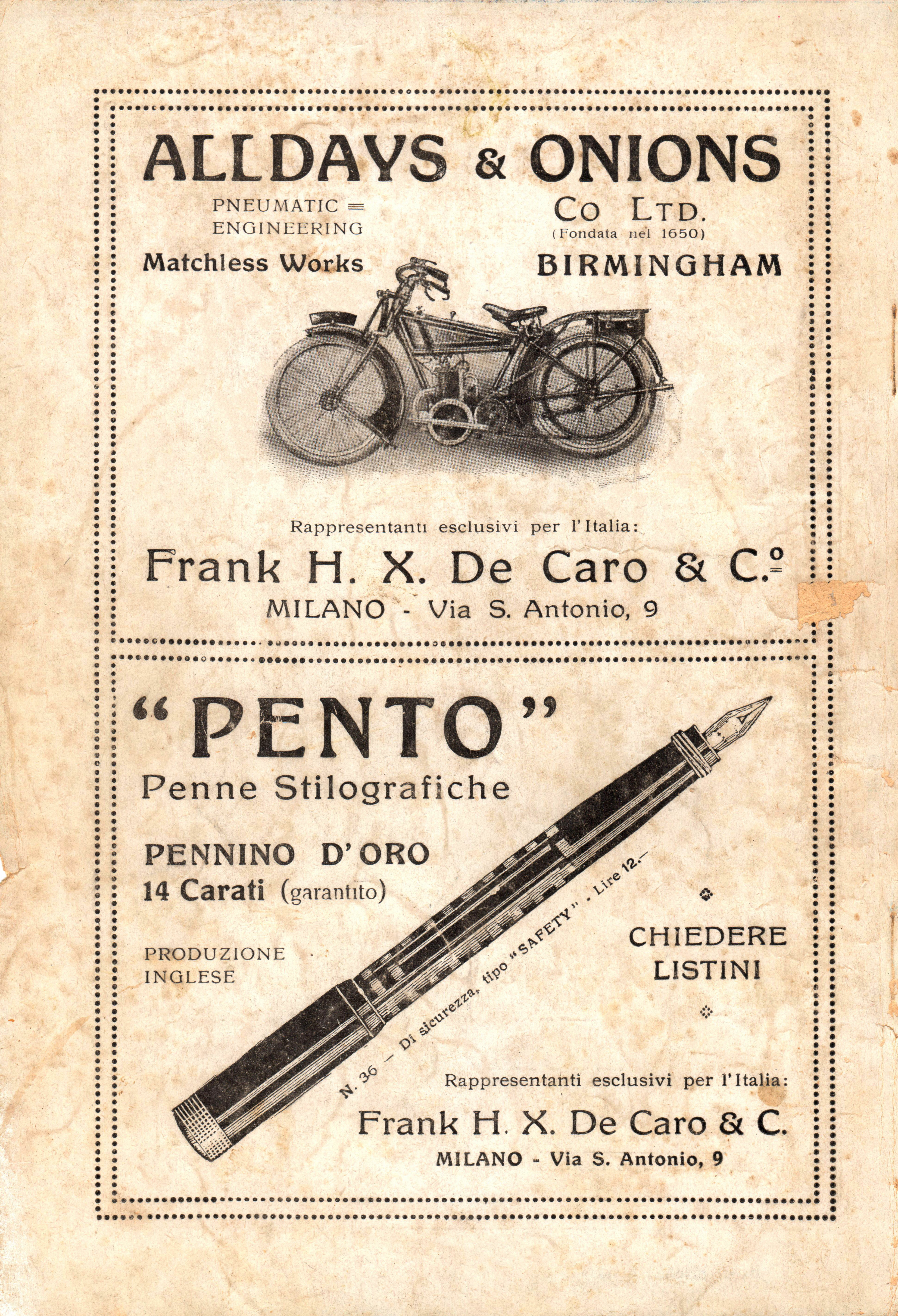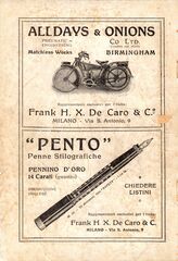 Scansione di una pubblicità Pento datata 1917. Pubblicazione su: Il Secolo XX. Rappresentante: "Frank H. X. De Caro & C.". Indica come indirizzo: "Via S. Antonio, 9, Milano". Data indicata dal fornitore, affidabile. Pubblicizza un modello rientrante denominato Pento N. 36.