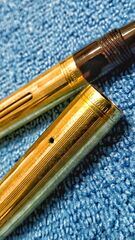 Foto di una penna Waterman. Modello: Waterman 0552½V. Caricamento a levetta. Realizzazione con rivestimento laminato con lavorazione sherathon. Penna piccola, da signora. Contributo di Gustavo, (utente forum gfrico2000).