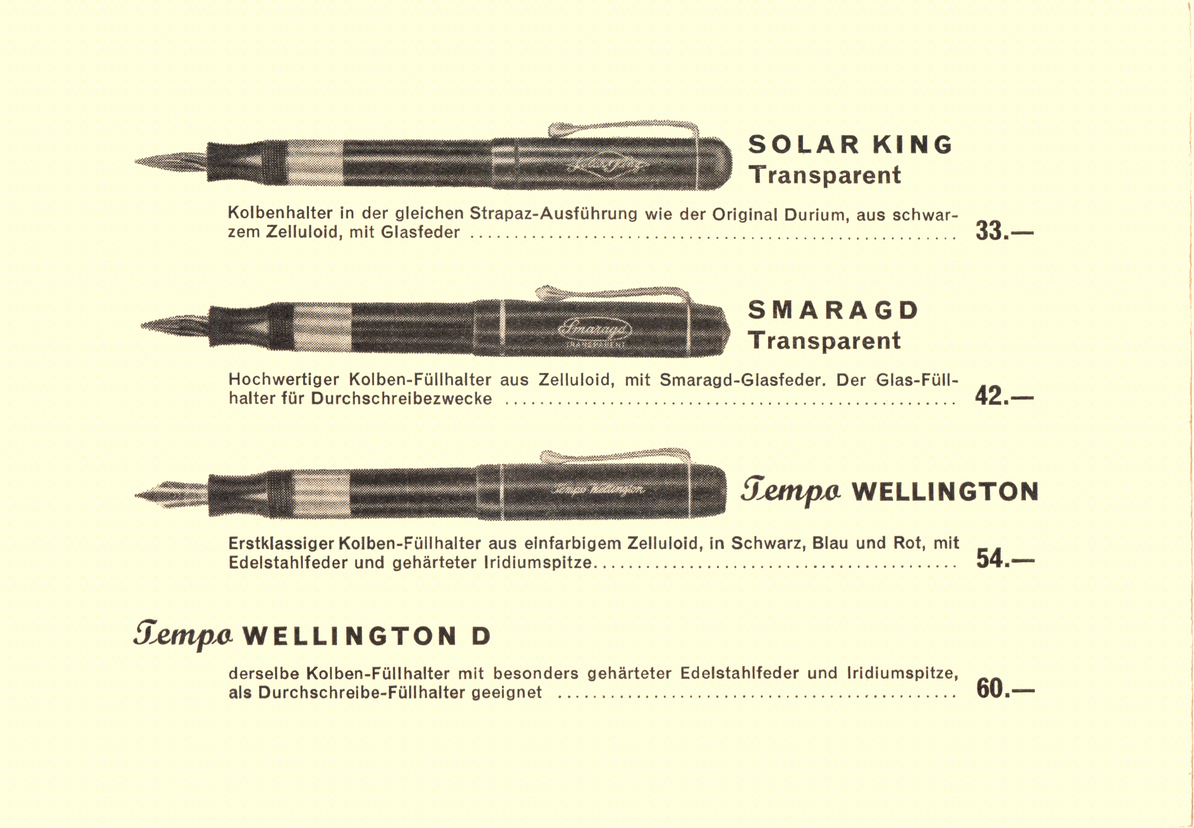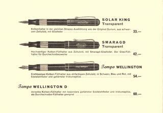 Scansione di una brochure Tempo datata 1953. Riferimento all'azienda come: "Erste Osterreichische Füllhalterfabrik". Ritoccata dall'autore per una migliore nitidezza. Data riportata su un'altra pagina. Secondo foglio centrale a brochure completamente aperta (brochure in foglio unico lungo ripiegato due volte, prima a metà verso sinistra, poi di nuovo a metà verso destra). Riporta dui modelli con pennino in vetro: Solar King Transparent e Smaragd Transparent e due modelli con pennino in acciaio Tempo Wellington e Tempo Wellington D.