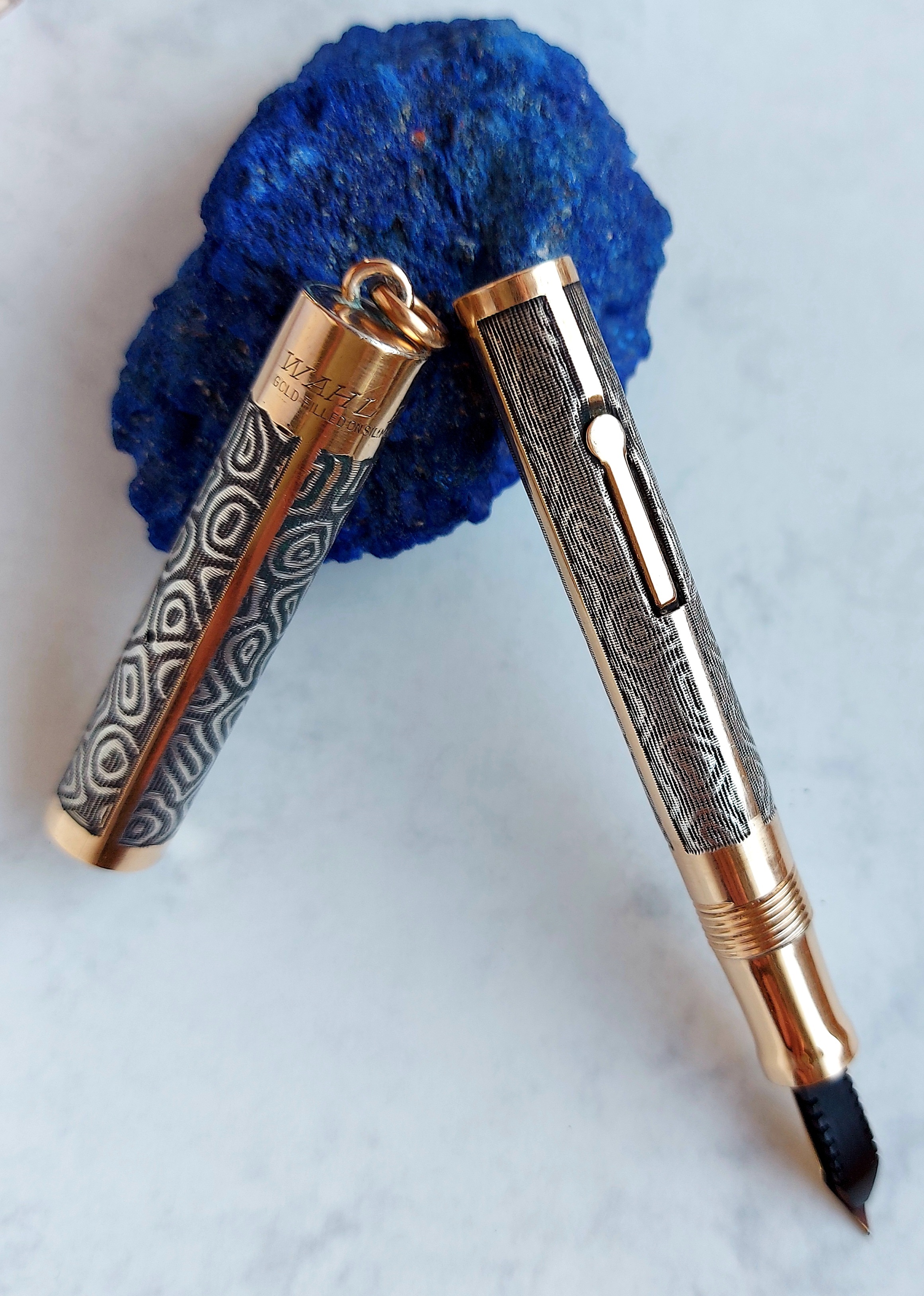 Foto di una penna Eversharp. Modello: Wahl Metal Pen. Caricamento a levetta. Realizzazione in vermeil con lavorazione guilloché e smalto. Misura piccola, da signora, nella lavorazione Niagara, detta anche "brain" o "coral". Contributo di Giorgio (utente forum Musicus).