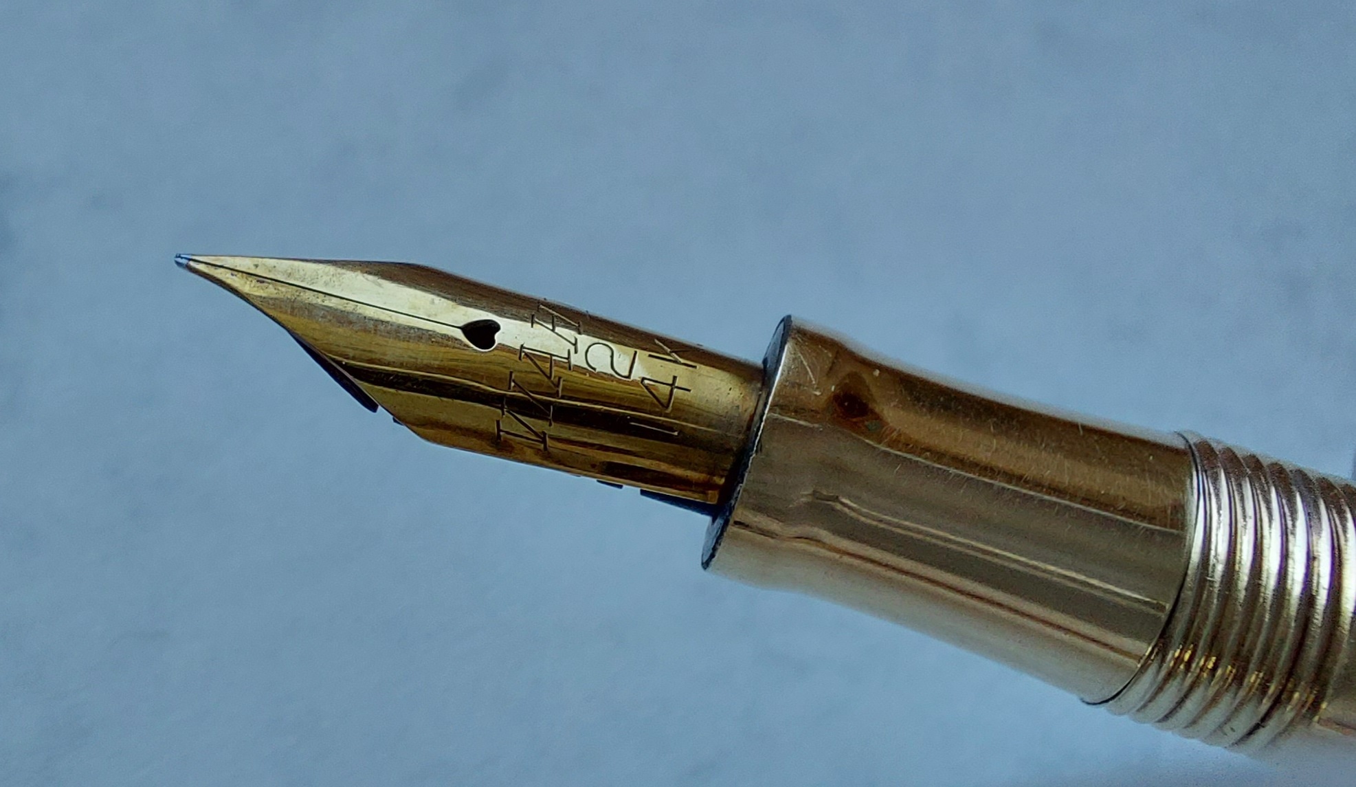 Foto di una penna Eversharp. Modello: Wahl Metal Pen. Caricamento a levetta. Realizzazione in vermeil con lavorazione guilloché e smalto. Dettaglio del pennino. Misura piccola, da signora, nella lavorazione Niagara, detta anche "brain" o "coral". Contributo di Giorgio (utente forum Musicus).