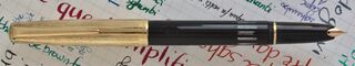 Photo of a pen produced by Columbus. Model: Columbus 65 stantuffo. Filling system: piston filler. In black plastic resin. Streamlined model with rolled gold cap and pearlescent jewel.