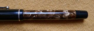 Photo of a pen produced by Valentine. Filling system: button filler. In marbled brown celluloid. Unknown model, with a "10" imprint on cap head.