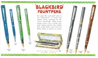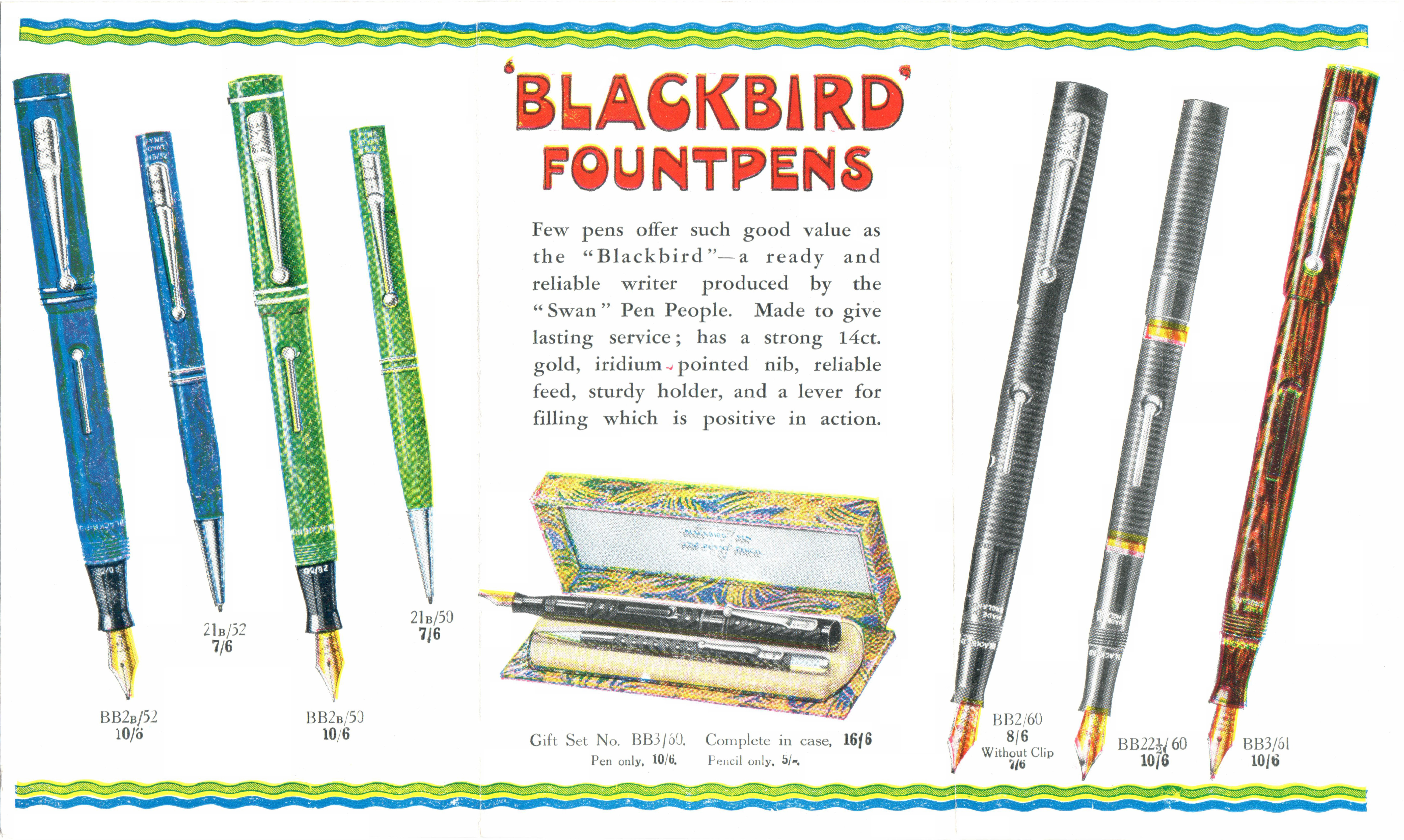 Scansione di una pubblicità Blackbird (sottomarca Swan) datata 1929. Ritoccata dall'autore per una migliore nitidezza. Data indicativa, dai modelli mostrati. Brochure realizzata da un foglio quadrato piegato a metà, e a sua volta piegato in tre a ribalta. Sezione del lato esterno all'interno della ripiagatura a ribalta, visibile una dispiegata quest'ultima. Pubblicizza dei modelli in celluloide Advertised Model:Blackbird BB2B e Blackbird BB2, e dei modelli in ebanite Blackbird BB2, Blackbird BB22½ e Blackbird BB3. Cita i colori con numerazione 50, 52, 60 e 61.