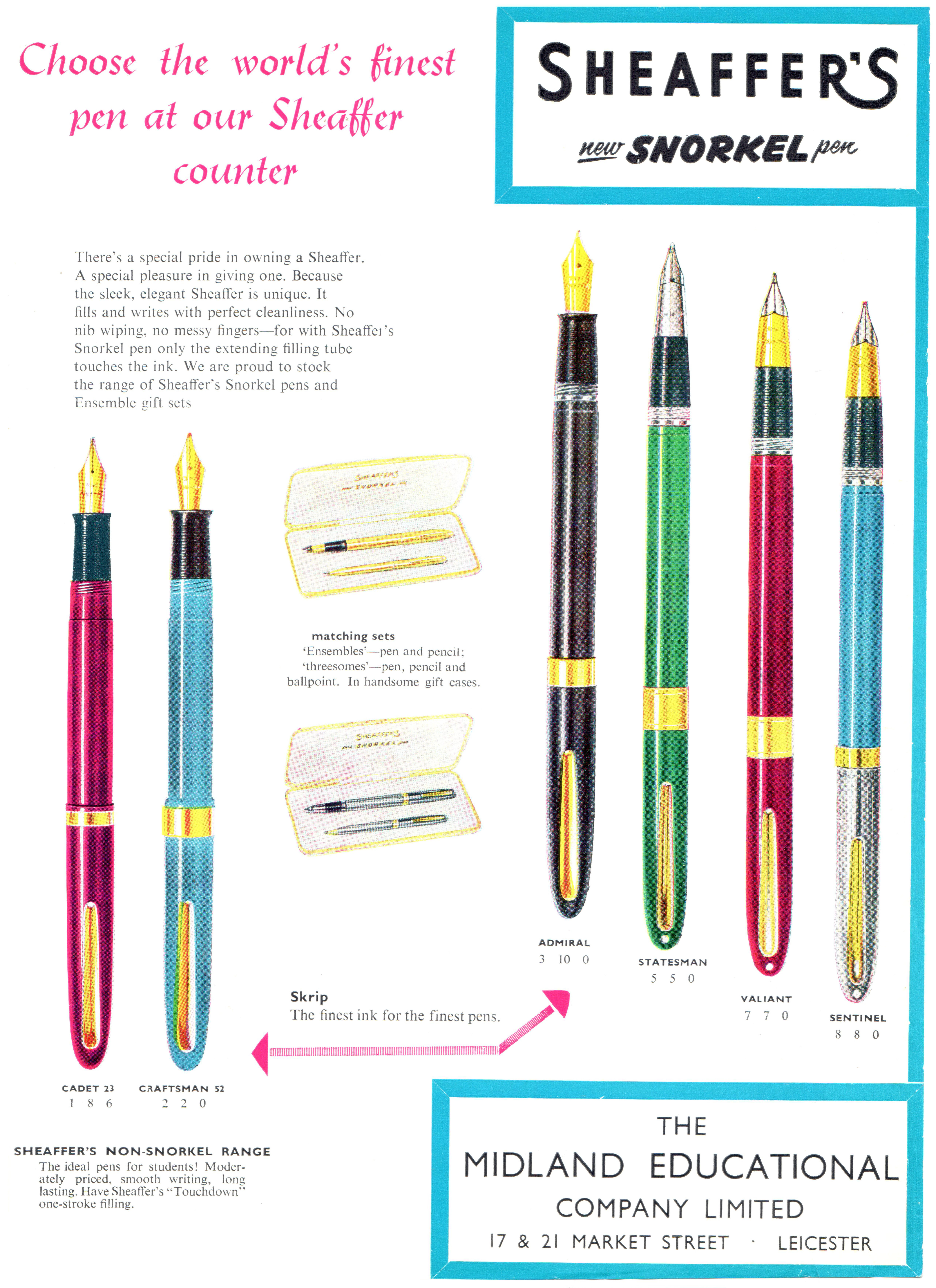 Scansione di una pubblicità Sheaffer datata 1956-10. Pubblicazione su: Leicester Graphic. Ritoccata dall'autore per una migliore nitidezza. Data riportata sul retro del foglio. Pubblicizza una serie di Snorkel Pen in diverse varianti: Admiral, Statesman, Valiant e Sentinel. E come penne di fascia più bassa destinate al mercato studentesco una Cadet 32 e una Craftsman 52.