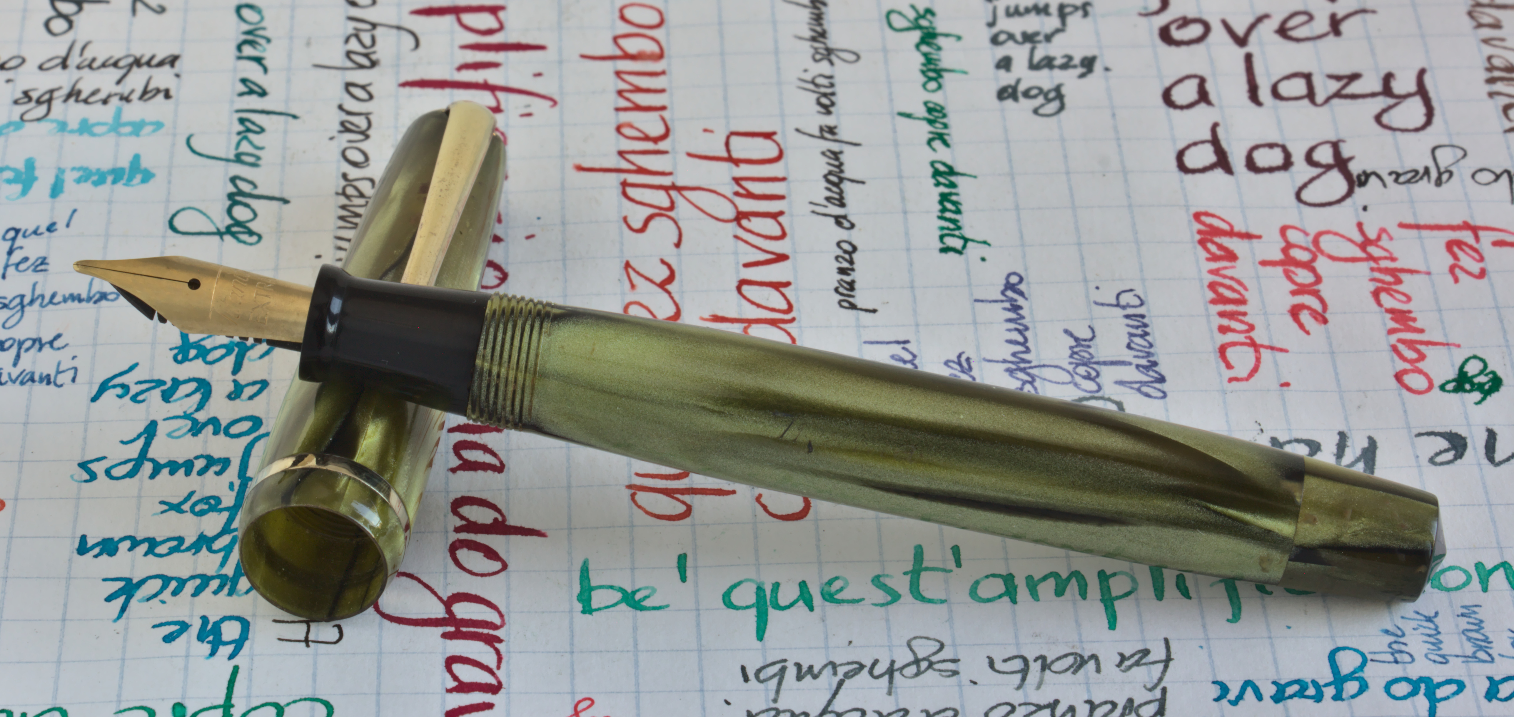 Foto di una penna Titania. Caricamento a pulsante di fondo. Realizzazione in celluloide striata verde chiaro. Modello non identificato.