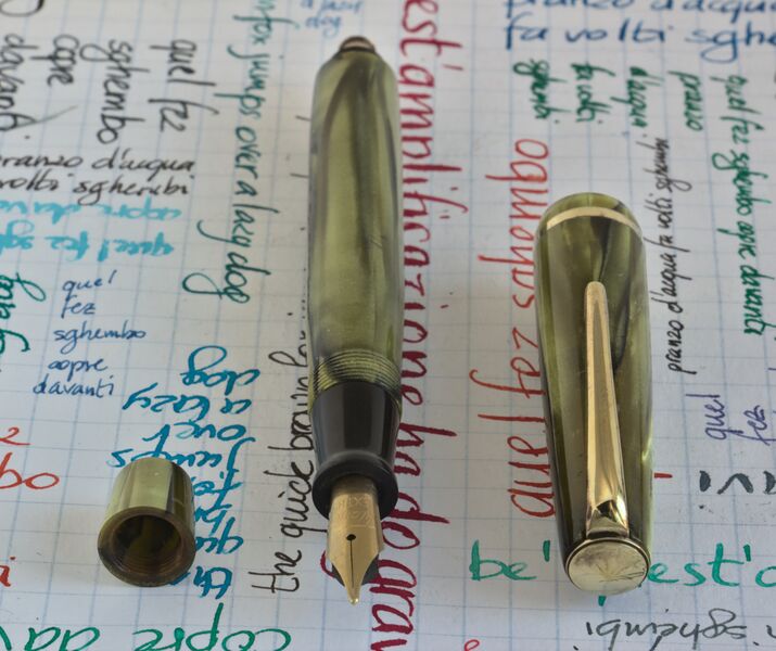 Foto di una penna Titania. Caricamento a pulsante di fondo. Realizzazione in celluloide striata verde chiaro. Modello non identificato.