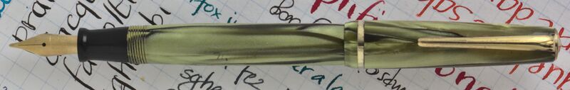 Foto di una penna Titania. Caricamento a pulsante di fondo. Realizzazione in celluloide striata verde chiaro. Modello non identificato.