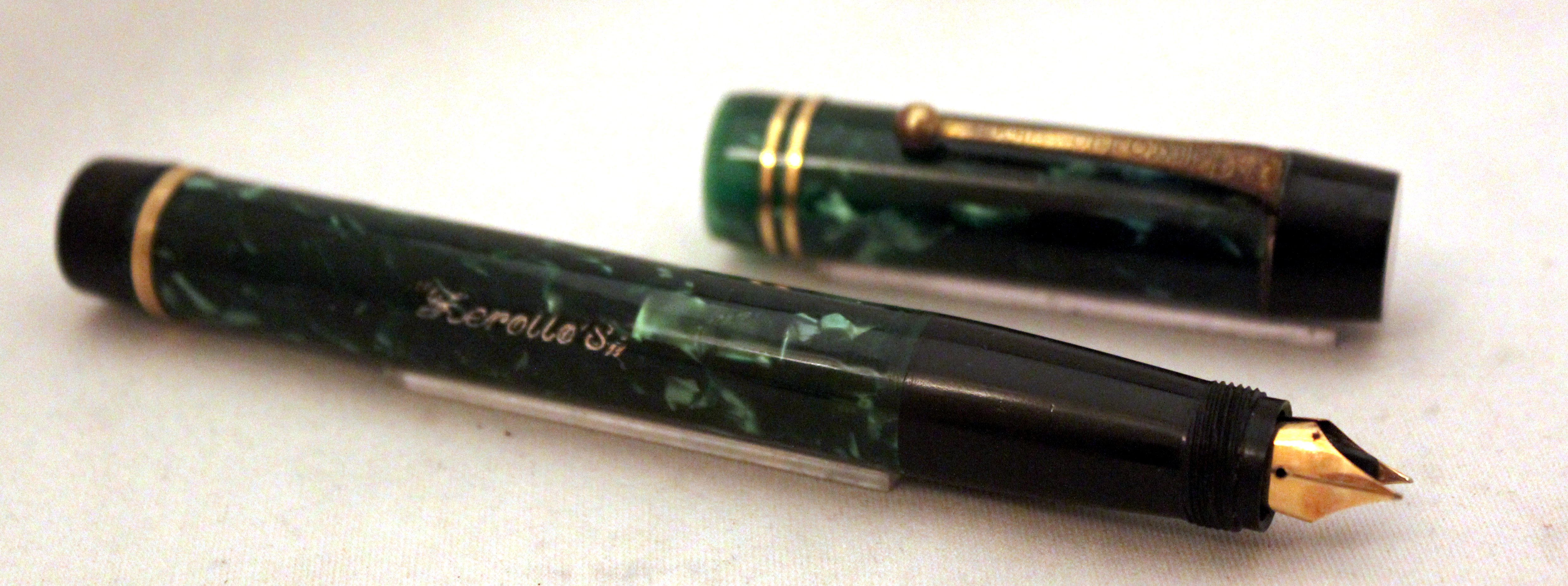 Foto di una penna Zerollo. Realizzazione in celluloide marmorizzata verde. Misura grande. Messa a disposizione da Marco Vanzi. Fotografata al Pen Show di Firenze del 2012.