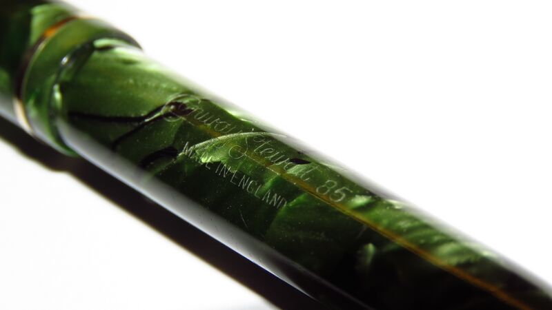 Photo of a pen produced by Conway Stewart. Model: Conway Stewart 85. Filling system: lever filler. In green marbled celluloid. Detail of inscription.