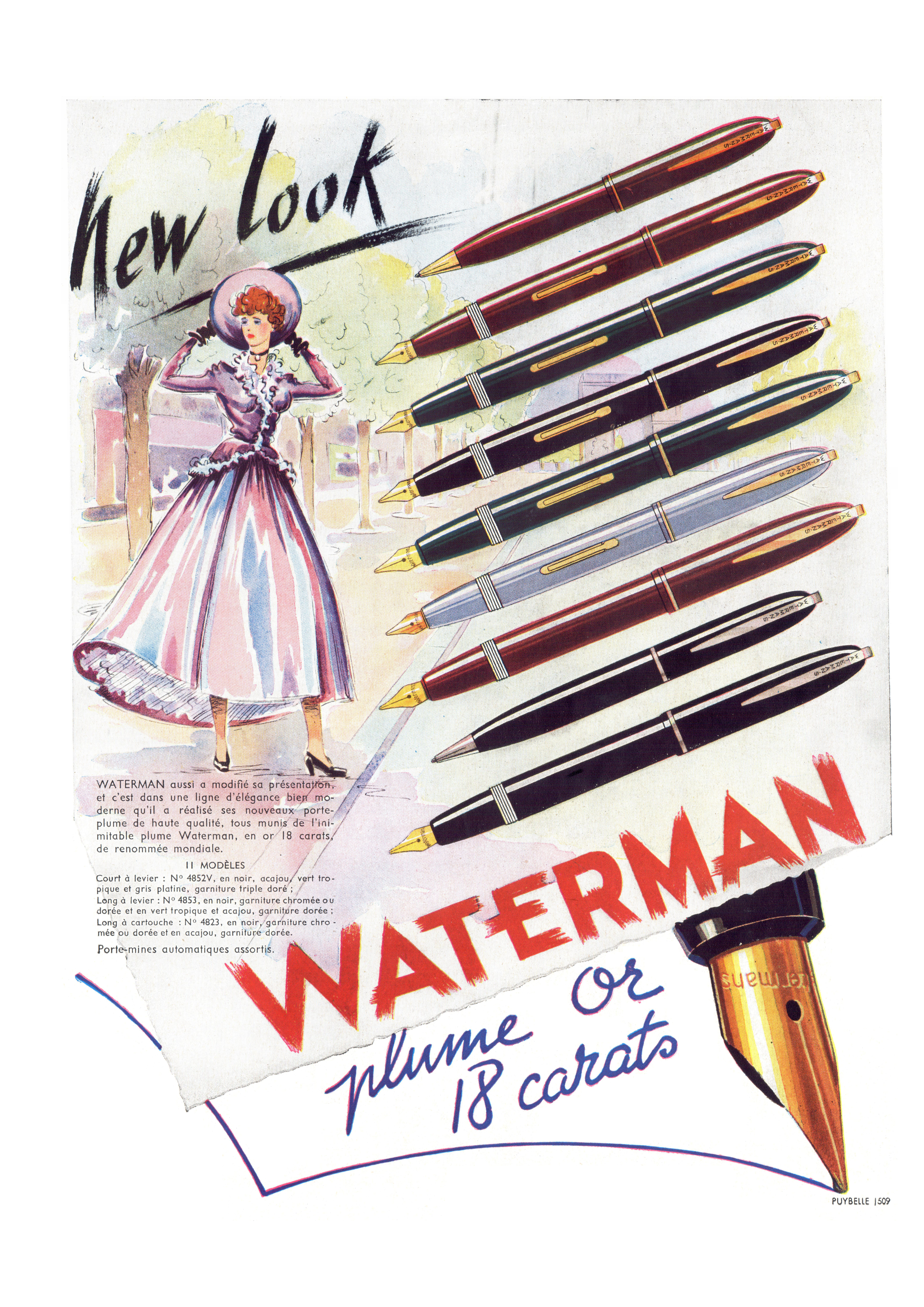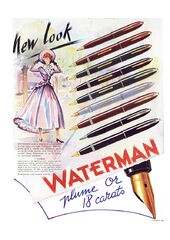 Scansione di una pubblicità Waterman datata 1948. Ritoccata dall'autore per una migliore nitidezza. Data indicata dal fornitore. Pubblicizza una serie di modelli affusolati con clip sopra il cappuccio chiamati in altre pubblicità Waterman Standard ma qui identificati come: Waterman 4852V per la versione corta con caricamento a levetta, Waterman 4853 per la versione lunga con caricamento a levetta e Waterman 4823 per la versione lunga con caricamento a cartuccia.