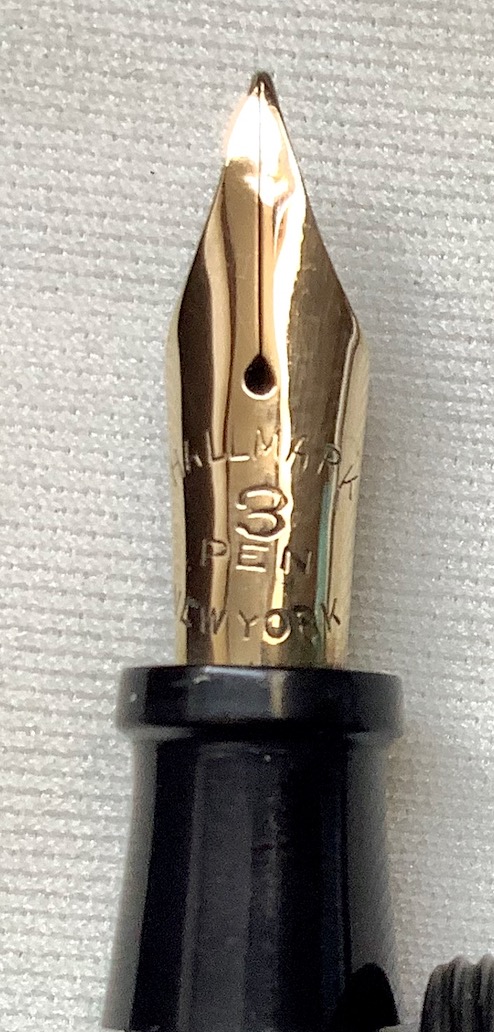 Photo of a pen produced by Hallmark. Filling system: lever filler. In a wave pattern black chased hard rubber. Detail of nib. There are imprints of Kraker patents nº US-1164654 and nº US-1199993 on barrel.