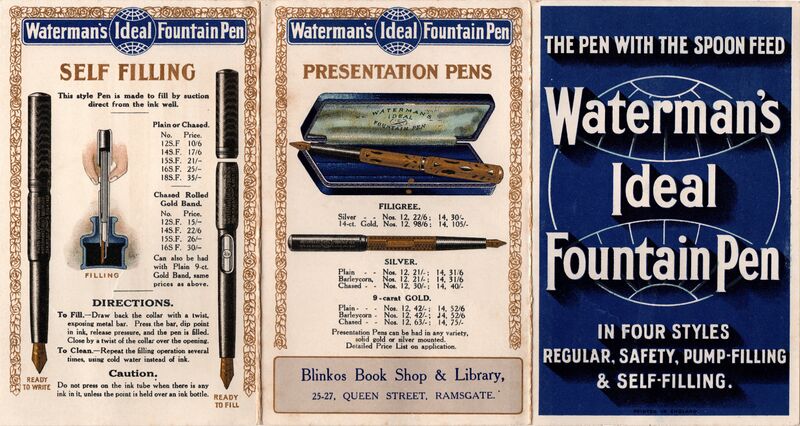 Scansione di un libretto Waterman datata 1911. Contributo di Giorgio (utente forum Musicus). Data indicativa, dai modelli illustrati. Lato esterno. Pubblicizza a sinistra i modelli denominati Self Filling con caricamento sleeve filler e cappuccio a frizione, nelle misure 12S.F., 14S.F., 15S.F., 16S.F., 18S.F., citando sia quelli ordinari che quelli rivestiti in metallo laminato. Al centro pubblicizza i modelli 12 denominati Presentation Set per i diversi rivestimenti disponibili di cui cita: filigree in argento e oro, in argento Plain, Barleycorn e Chased, e gli stessi in oro a 9 carati. Sull'altro lato di File:191x-Waterman-Brochure-GB-Back.jpg.