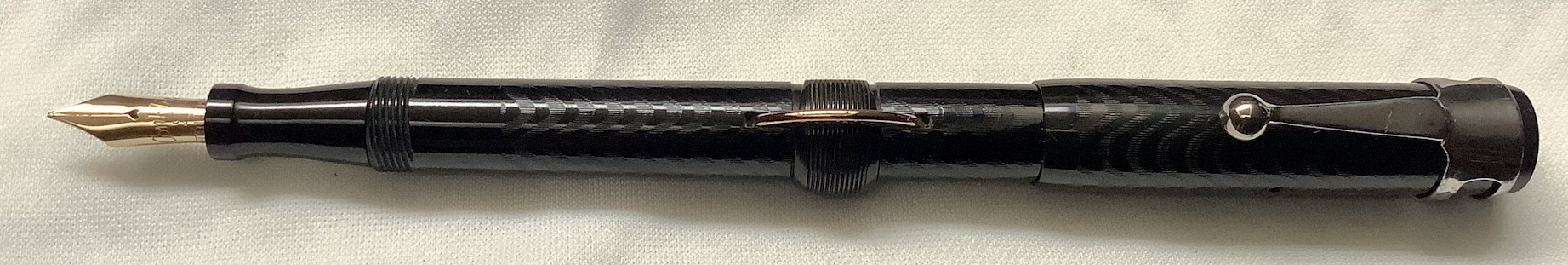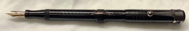 Photo of a pen produced by Conklin. Model: Crescent Filler 20. Filling system: crescent filler. In a wave pattern black chased hard rubber. Small size with n. 2 nib, accomodation clip version. Imprints of nº US-448360 and nº US-745481 patents on the body.