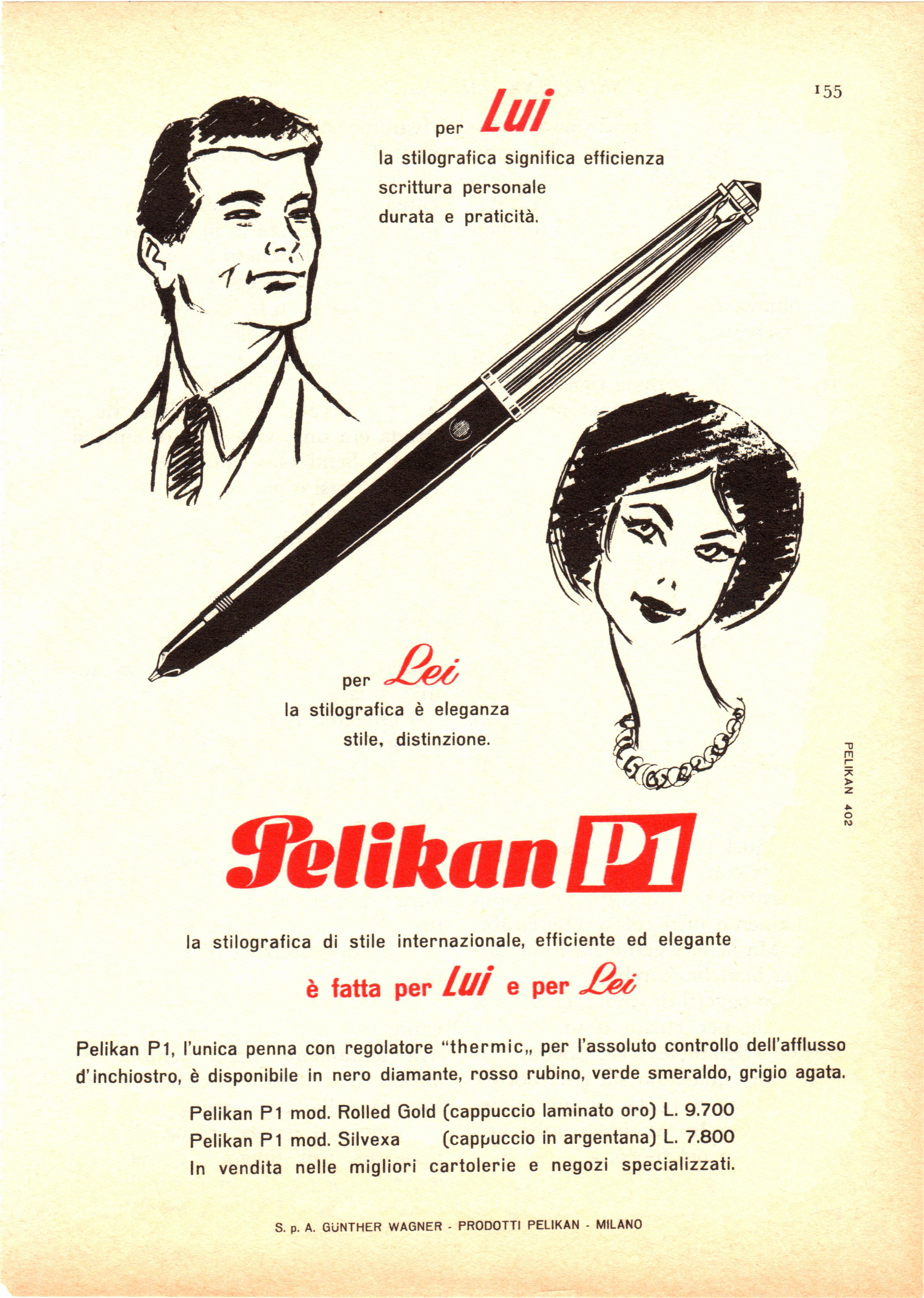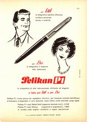 Scansione di una pubblicità Pelikan datata 1962. Pubblicazione su: Selezione dal Reader's Digest. Data indicativa, dal modello mostrato. Pubblicizza il modello P1 nelle versioni Rolled Gold con cappuccio laminato oro e Silvexa con cappuccio in argentana (alpacca).