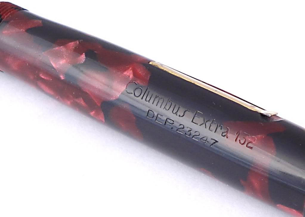 Foto di una stilografica Columbus modello 132 in celluloide marmorizzata rossa. Realizzata da Fabio (utente forum fountainpen.it fabbale09). Pubblicata col permesso dell'autore.