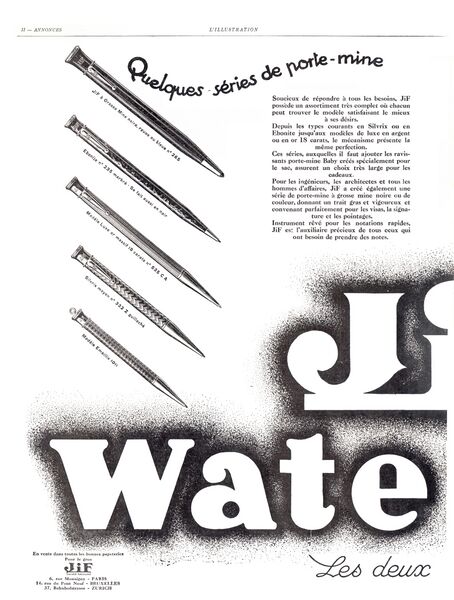 Scansione di una pubblicità Waterman datata 1929-09-07. Pubblicazione su: L'Illustration, n. 4514, pag. III. Ritoccata dall'autore per una migliore nitidezza. Data visibile direttamente. Pubblicità congiunta la JiF, di cui mostra una serie di matite meccaniche. Pagina sinistra.