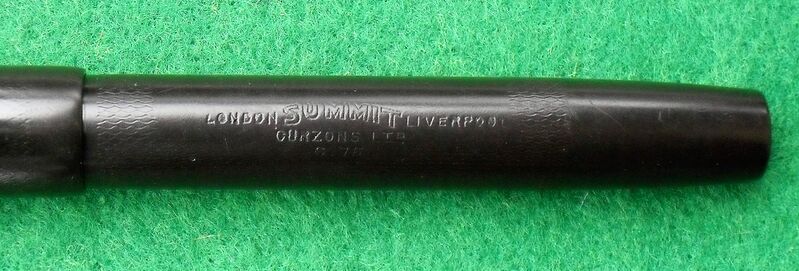 Foto di una penna Summit (un marchio della Lang - Curzon - Summit). Modello: Summit S.75. Caricamento a levetta. Realizzazione in celluloide nera cesellata. Dettaglio della stampigliatura. Seconda versione (mk2), risalente poco prima la metà degli anni '30 (vedi questa recensione). Contributo di Alberto (utente forum A Casirati).