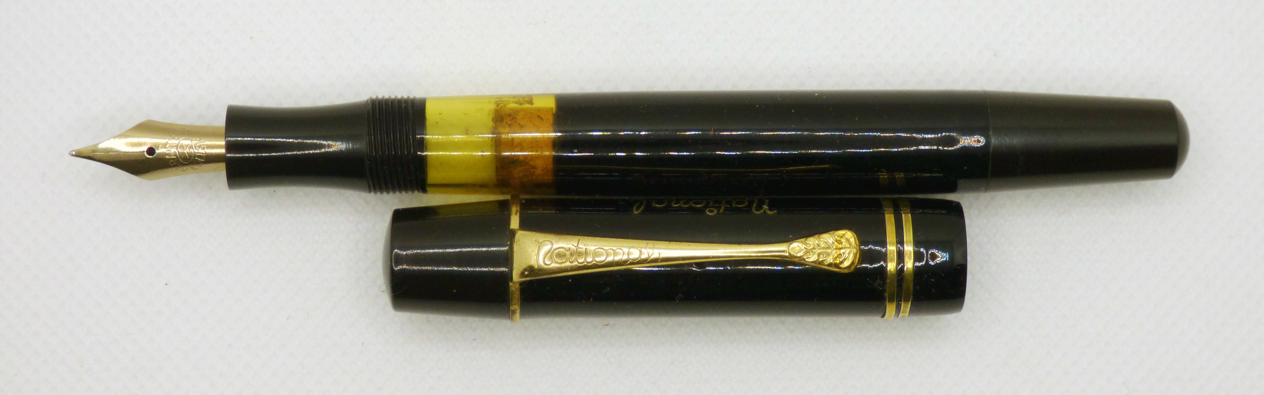 Photo of a pen produced by National. Model: National Favorit. Filling system: piston filler. In black celluloid. Substitution nib?