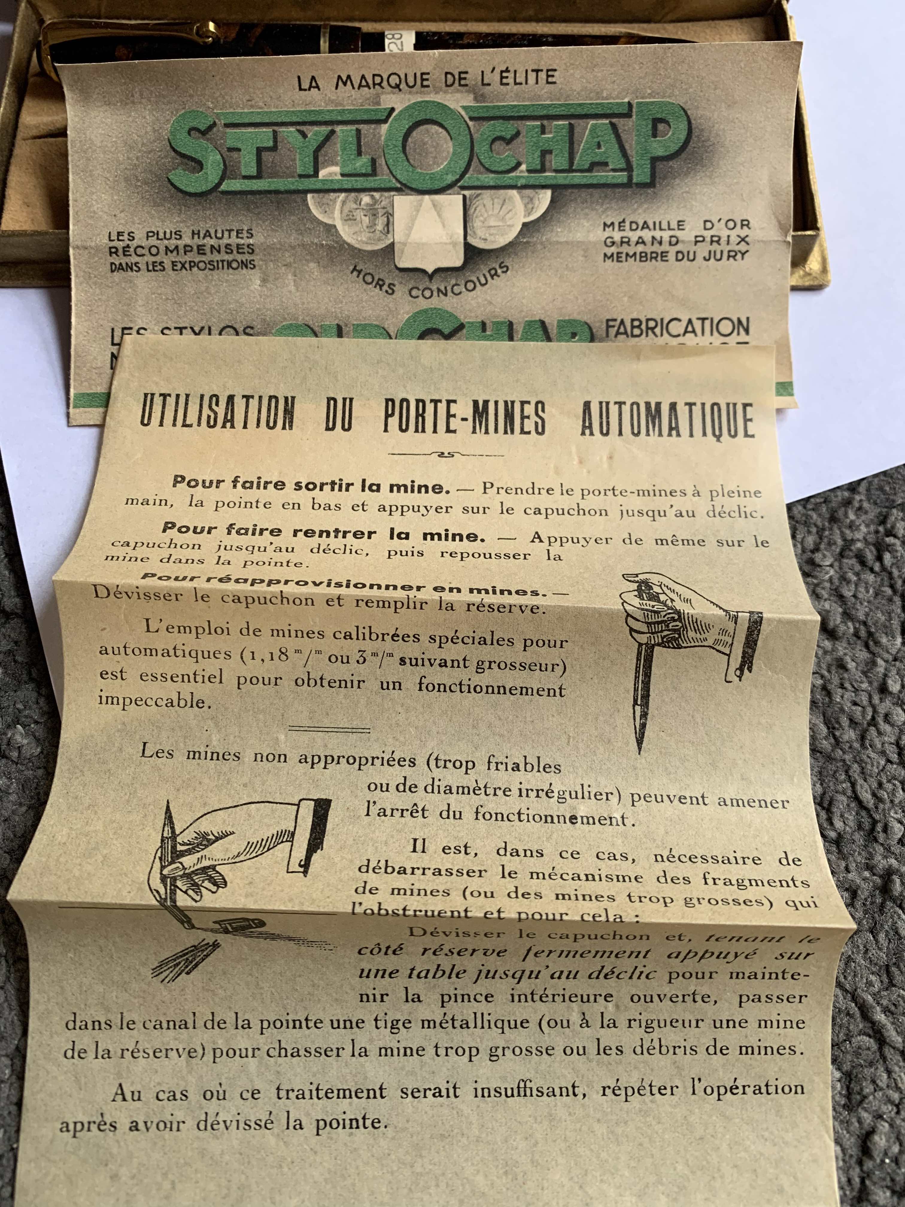 Foto di una combinazione penna/matita meccanica OldChap. Caricamento a levetta. Realizzazione in celluloide marmorizzata marrone. Modello ignoto. Contributo di lukogene.
