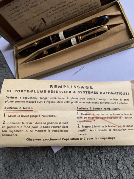 Photo of a pen/pencil set produced by OldChap. Filling system: lever filler. In marbled brown celluloid. Unknown model.