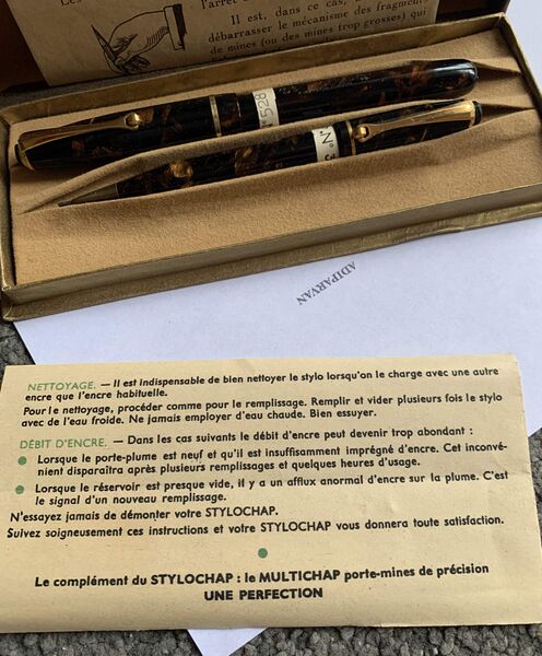Photo of a pen/pencil set produced by OldChap. Filling system: lever filler. In marbled brown celluloid. Unknown model.