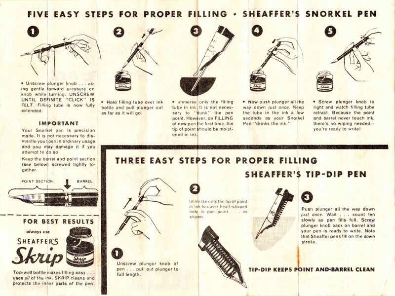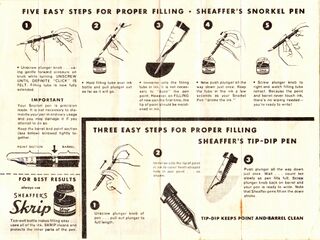 Scansione di un foglietto di istruzioni Sheaffer del 1956. Relativo ad un modello Snorkel Pen. Data indicativa, dal codice riportato su un lato (10-56) che potrebbe ragionevolmente indicare l'anno. Lato interno, con le istruzioni per i caricamenti Snorkel e TIPdip. Sull'altro lato di File:1954-Sheaffer-Snorkel-TipDip-Ext.jpg. Contributo di David Parisi (utente forum pencilator). Da una confezione originale.