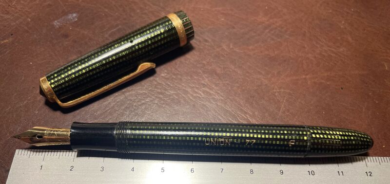 Versione del 21 mar 2023 alle 01:01 di Piccardi (discussione | contributi) (== Dettagli == {{PhotoInfo |Marca=Union Vulpenhouderfabriek |Modello=Airless 77 |Oggetto=pen |Caricamento=piston |Contributo=Jaconib |Materiale=celluloide |MatDesc_it=a righe quadrettate verdi |MatDesc_en=green squared lines |Note_it=Modello marcato ''Union - 77'' sul fusto, e ''Airless'' sull'anello del cappuccio. |Note_en=Model marked ''Union - 77'' on barrel, with ''Airless'' imprint on cap ring. }})