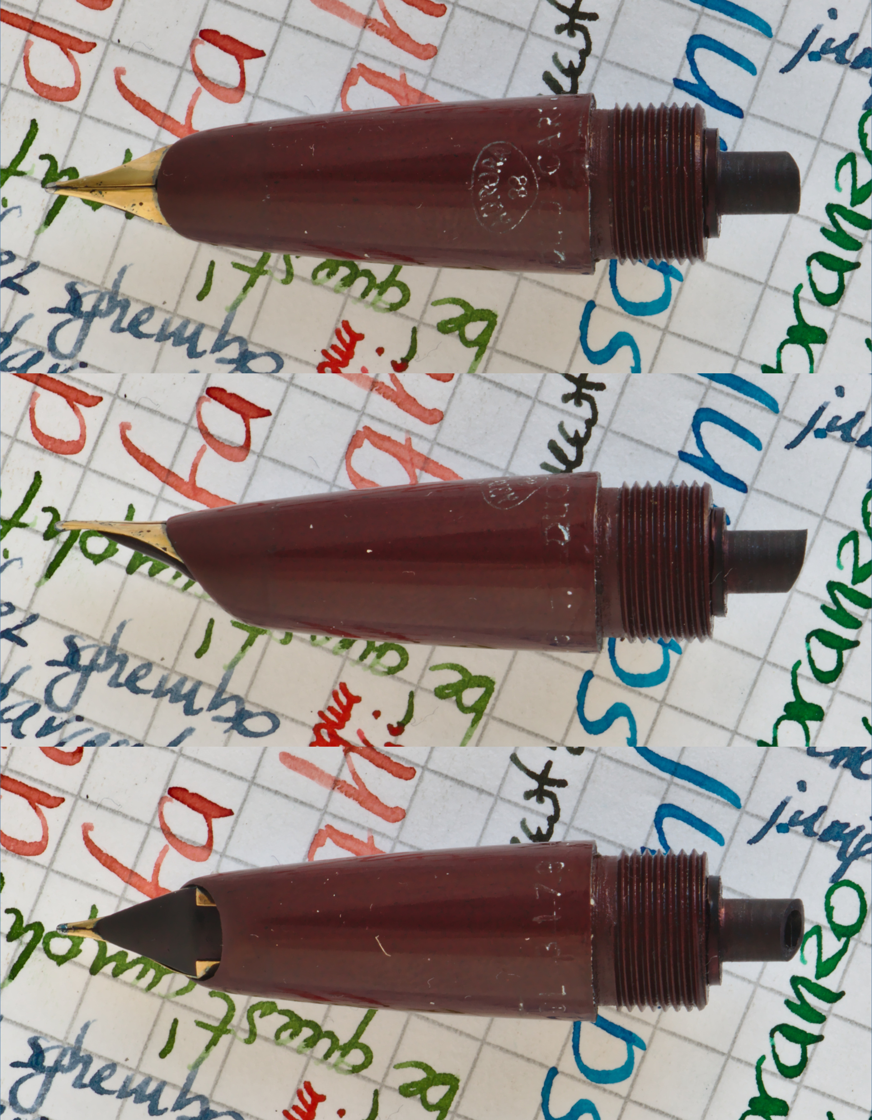 Photo of a pen produced by Aurora. Model: Duo-Cart. Filling system: cartridge filler. In celluloid. Detail of nib. Detail of feeder. Red section gray/green barrel version.