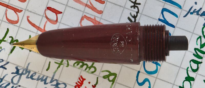 Photo of a pen produced by Aurora. Model: Duo-Cart. Filling system: cartridge filler. In celluloid. Detail of nib. Red section gray/green barrel version.