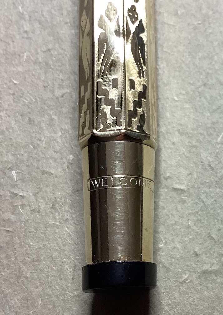 Photo of a pen produced by Welcome. Filling system: safety. With geometric pattern gold rolled overlay. Detail of inscription. Unidentified model.