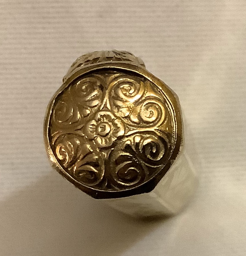 Photo of a pen produced by Welcome. Filling system: safety. With geometric pattern gold rolled overlay. Detail of cap head. Unidentified model.