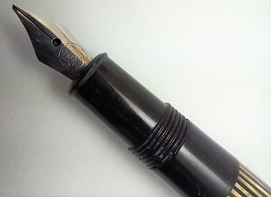 Foto di una penna Goldring. Caricamento a stantuffo. Realizzazione in celluloide tartaruga. Dettaglio del pennino. Modello marcato Onyx con pennino della VEB Berliner Schreibfeder. Contributo di Günter, (utente forum eppoh2).