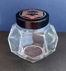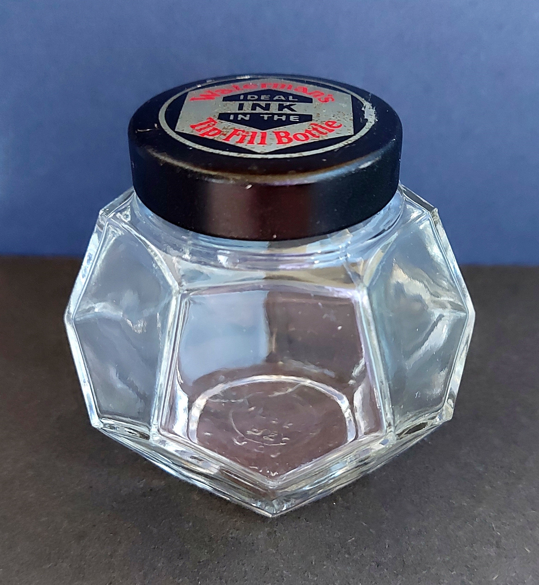 Photo of an ink bottle produced by Waterman. A De Luxe Tip-Fill ink bottle.