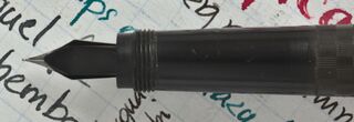 Photo of a pen produced by Olivieri. In checkerboard pattern black chased hard rubber. Detail of feeder. With accomodation clip.