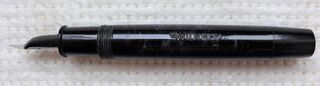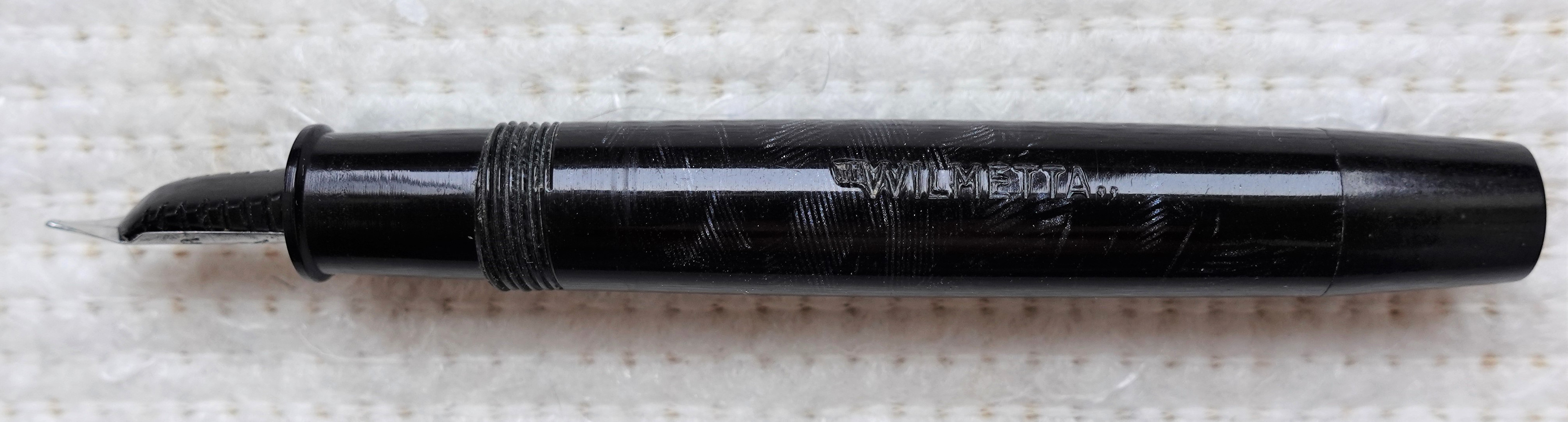 Photo of a pen produced by Wilmas. Model: Wilmetta. Filling system: button filler. In dark blue pine needles celluloid. Small model.