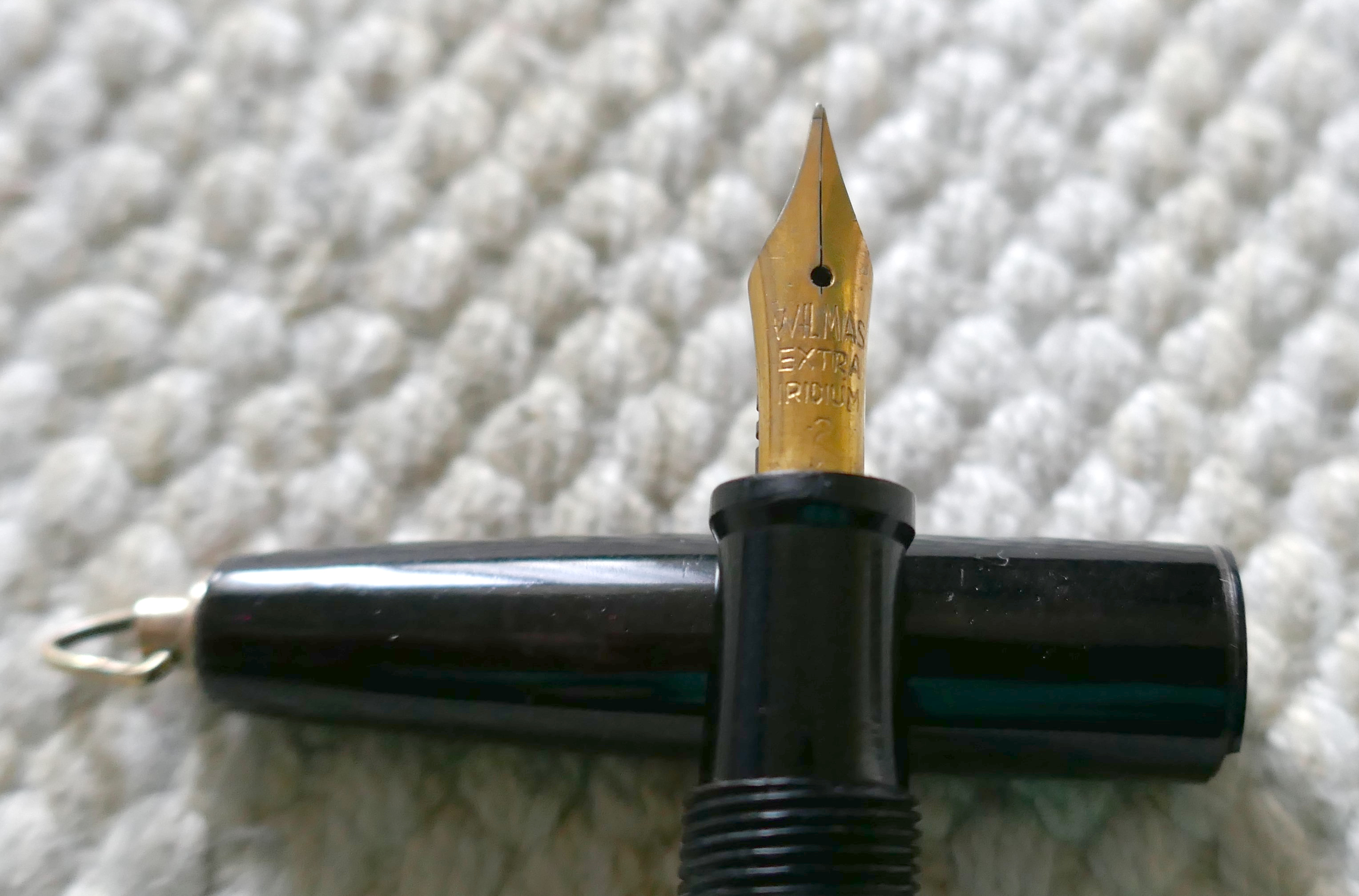 Foto di una penna Wilmas. Caricamento a pulsante di fondo. Realizzazione in celluloide nera. Dettaglio del pennino. Modello piccolo da signora. Contributo di Andrea (utente forum bisguillo).