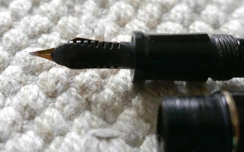 Photo of a pen produced by Wilmas. Filling system: button filler. In black celluloid. Detail of feeder. Small lady model.
